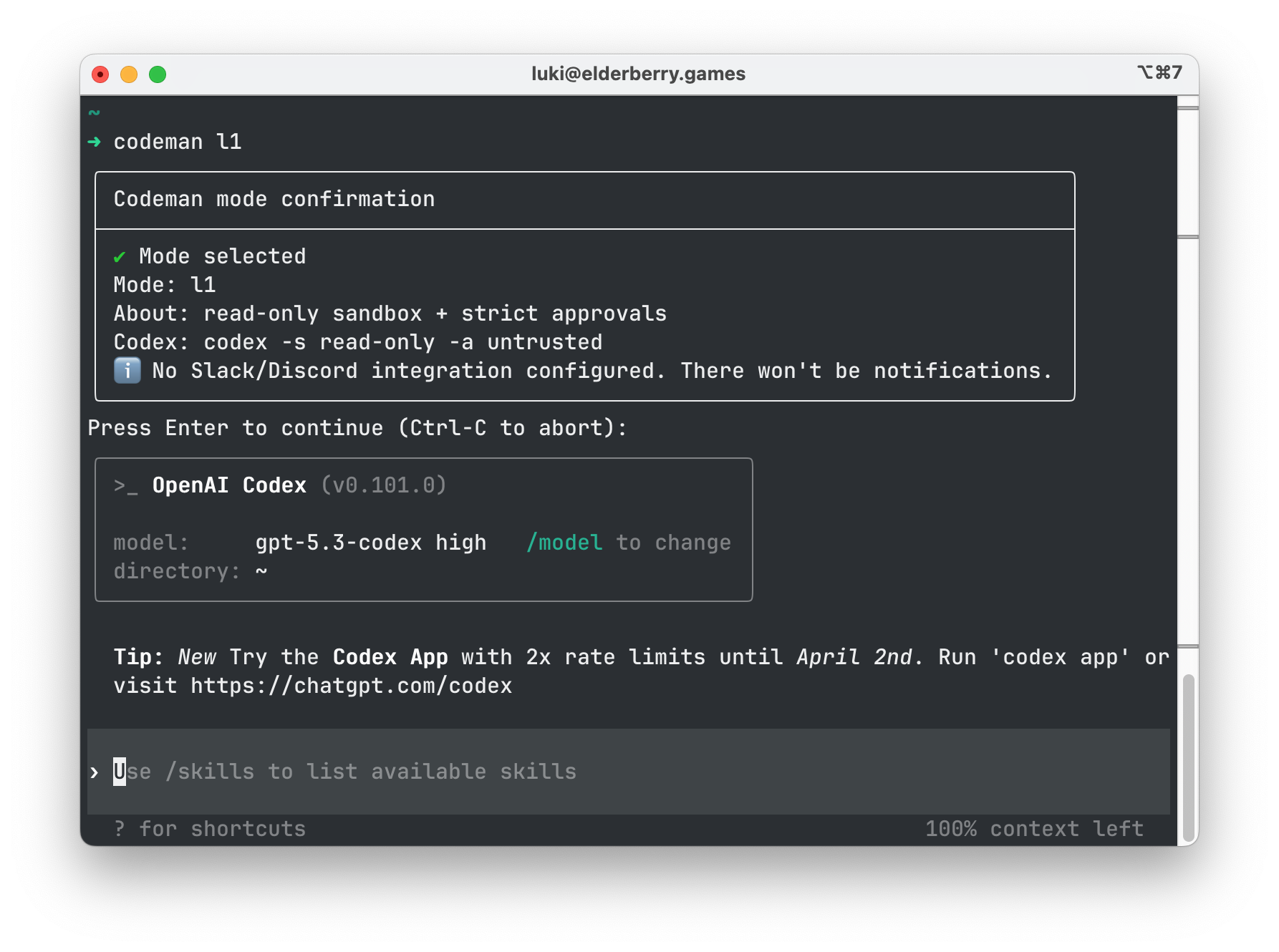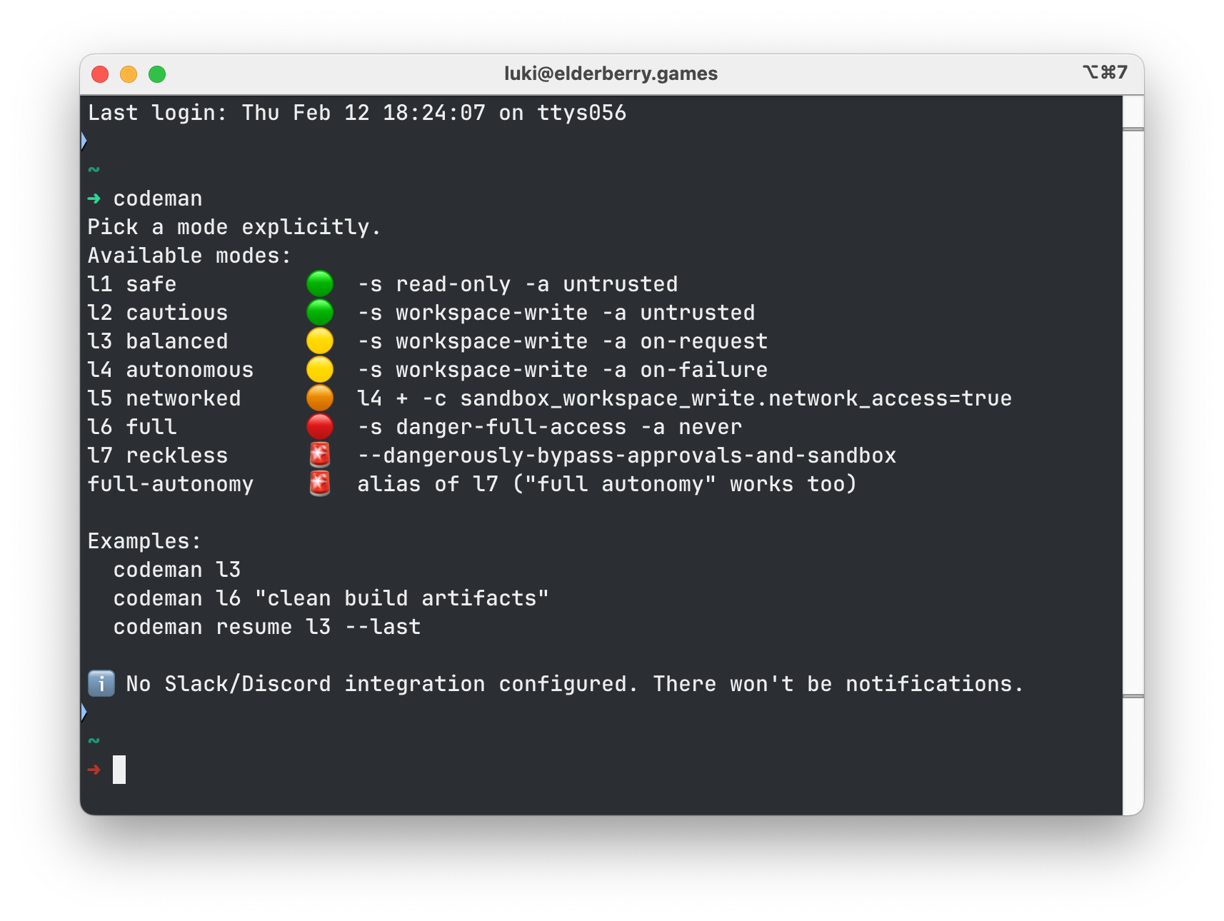 Codeman is intentionally blunt. You either pick a mode or you don’t run.